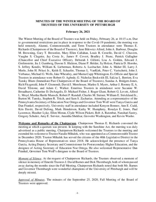 University of Pittsburgh Board of Trustees Public Meeting Minutes, February 26, 2021